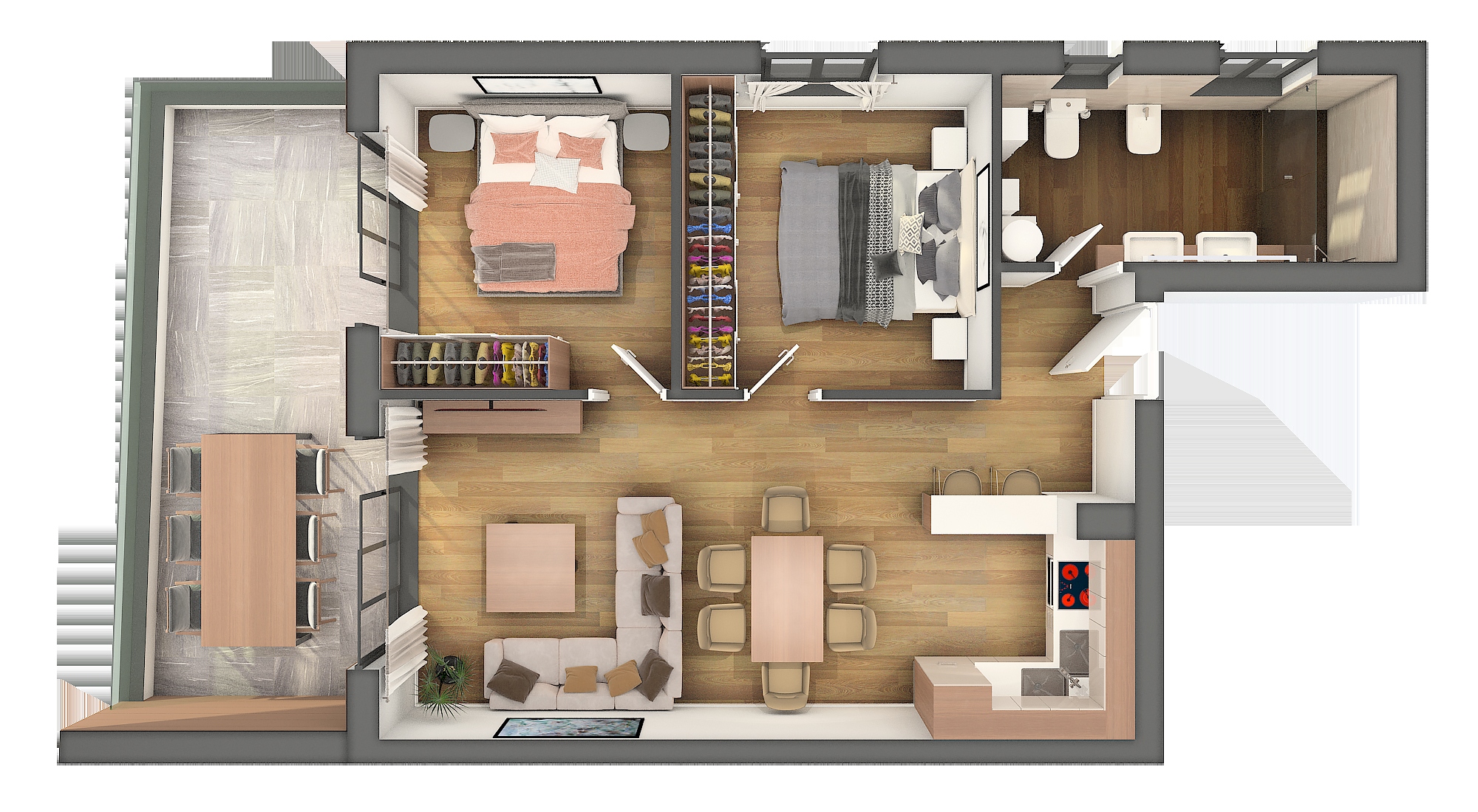 The apartment consists of: two bedrooms, living room + kitchen + dining area, bathroom, and covered terrace.