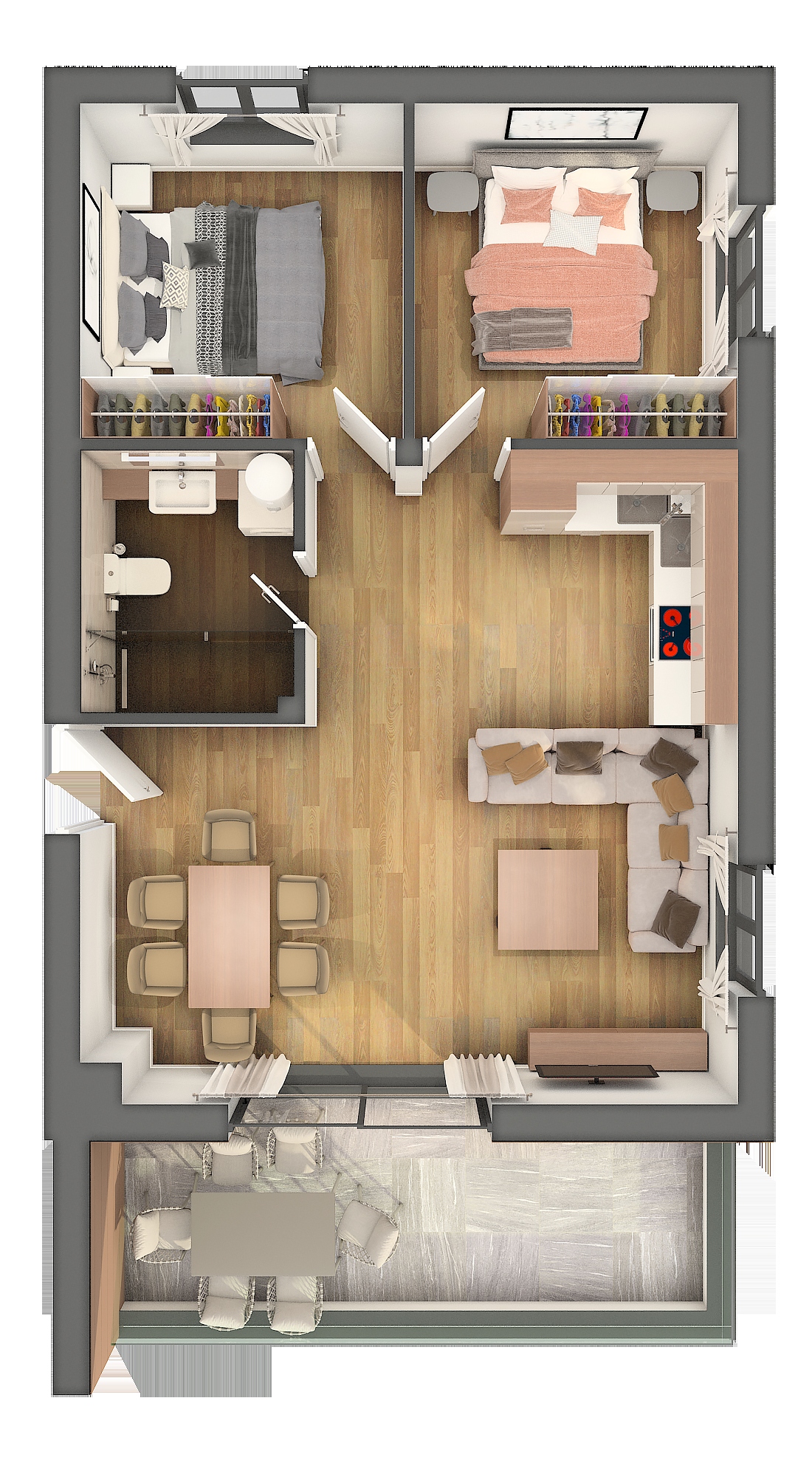 The apartment consists of: two bedrooms, living room + kitchen + dining area, bathroom, and covered terrace.