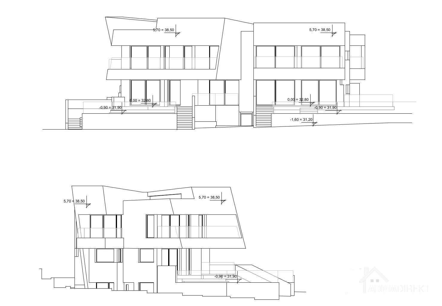 First floor: three bedrooms, three bathrooms, hallway, and three terraces.