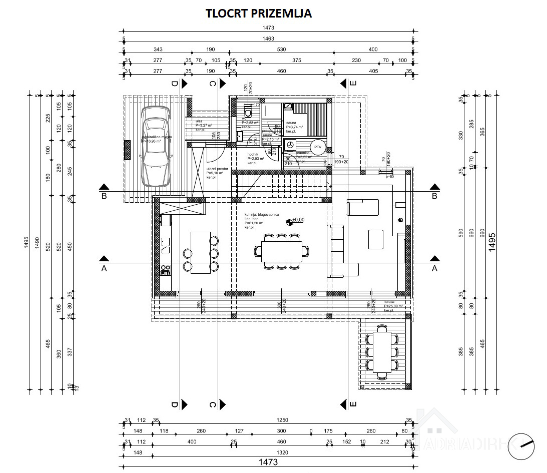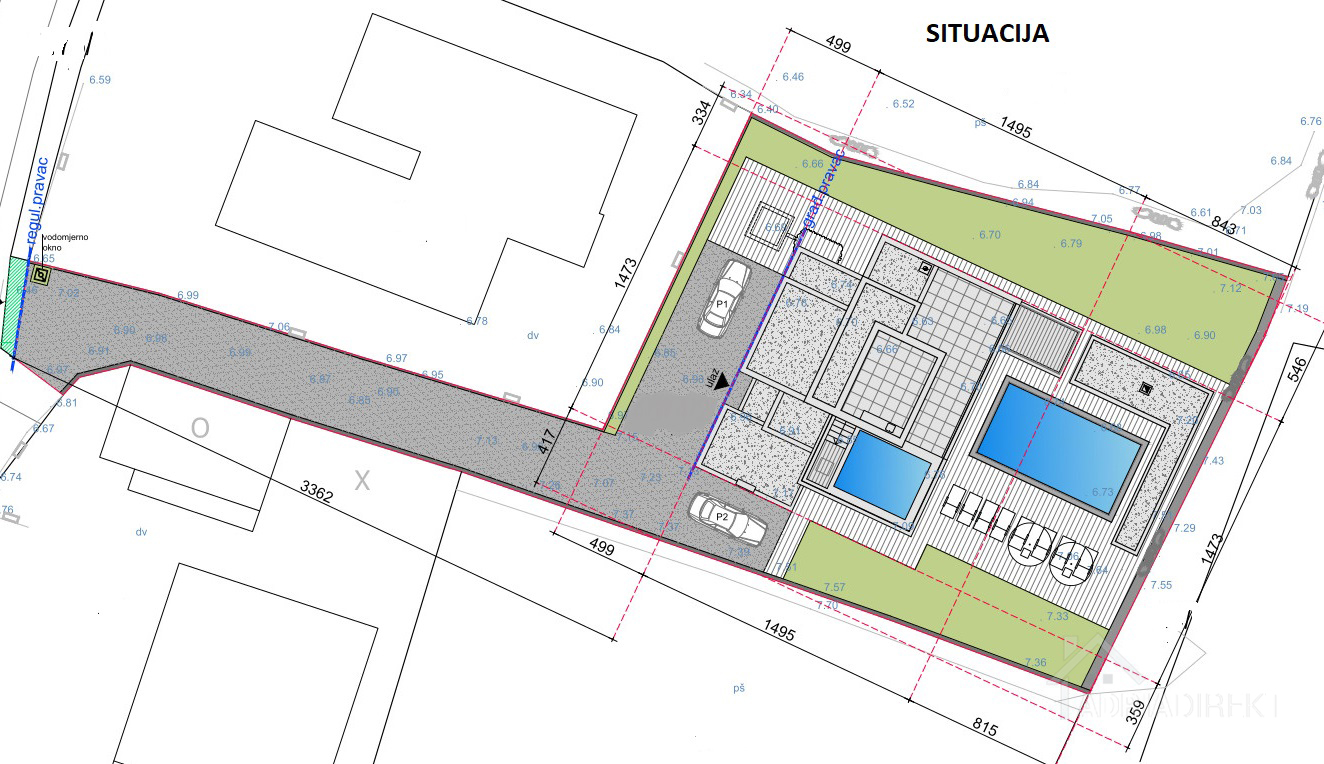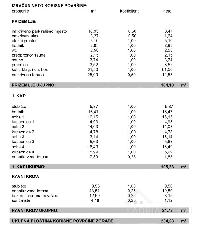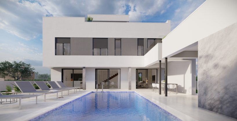 Zadar – Zaton, for sale is a detached villa with two floors, a living area of 234.23 m², built in 2024 on a plot of 761 m². High-quality construction, built with Protherm bricks, with reinforced concrete slabs, beams, and columns, thermal insulation (facade) with a thickness of 10 and 15 cm, PVC windows in anthracite on the outside and white on the inside, electric shutters, heating of the property and hot water via a heat pump, cooling and additional heating via air conditioning, sewage disposal in a biological treatment plant, three-phase electricity connection (13.80 kW). The pool areas are made of reinforced concrete (outdoor pool in the garden with a depth of 1.5 m and a smaller pool on the roof terrace with a depth of 1 m). In addition, a heat pump will be installed to heat the pool water and a video system will be installed for surveillance. The garden pool is designed so that it can be used as a closed type (bioclimatic pergola or awning and glass walls), etc.