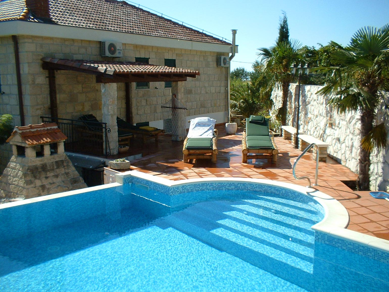 Na severnej strane sa nachádza bazén, ktorý je umiestnený na nádvorí vyloženom kamennými doskami. Bazén má rozmery 8,2 x 4 m a hĺbku 1,8 m a je možné ho využívať 9 mesiacov v roku. Obklopuje ho krytá terasa s rozlohou 150 m². Z bazéna je nerušený výhľad na more.