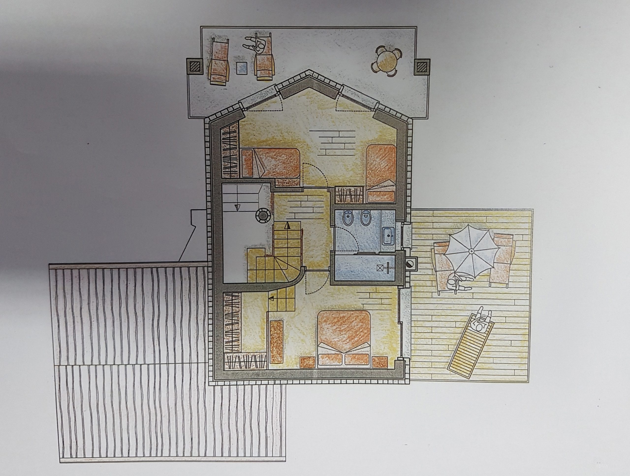 Prízemie: obývacia izba + kuchyňa + jedálenský kút, kúpeľňa a veľká terasa.