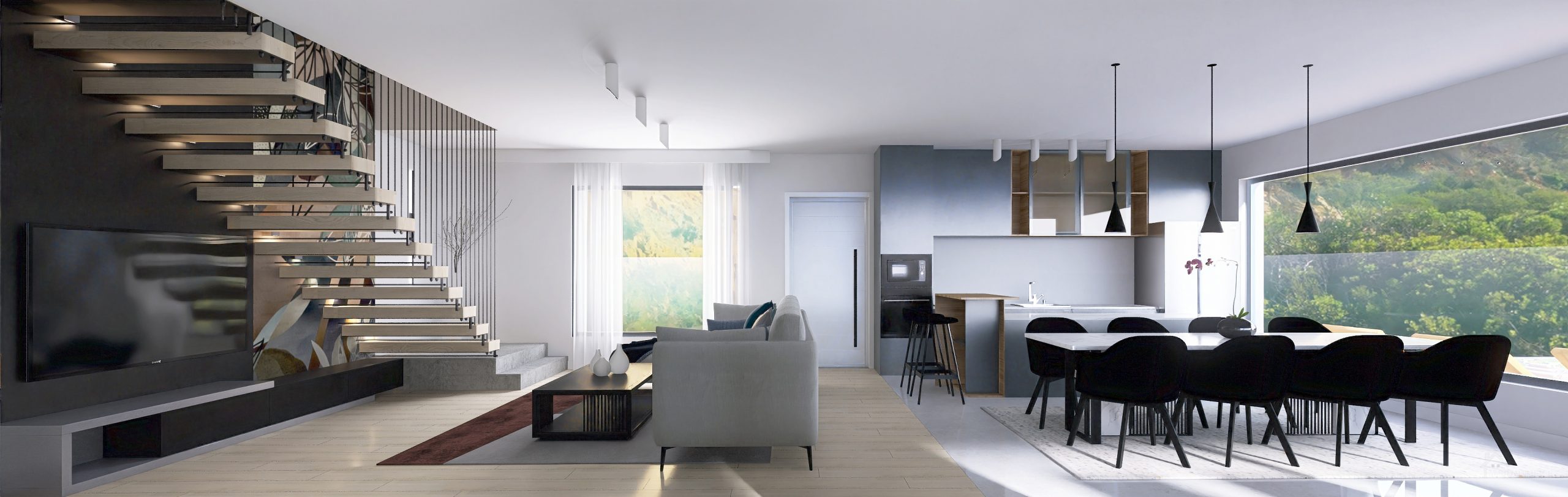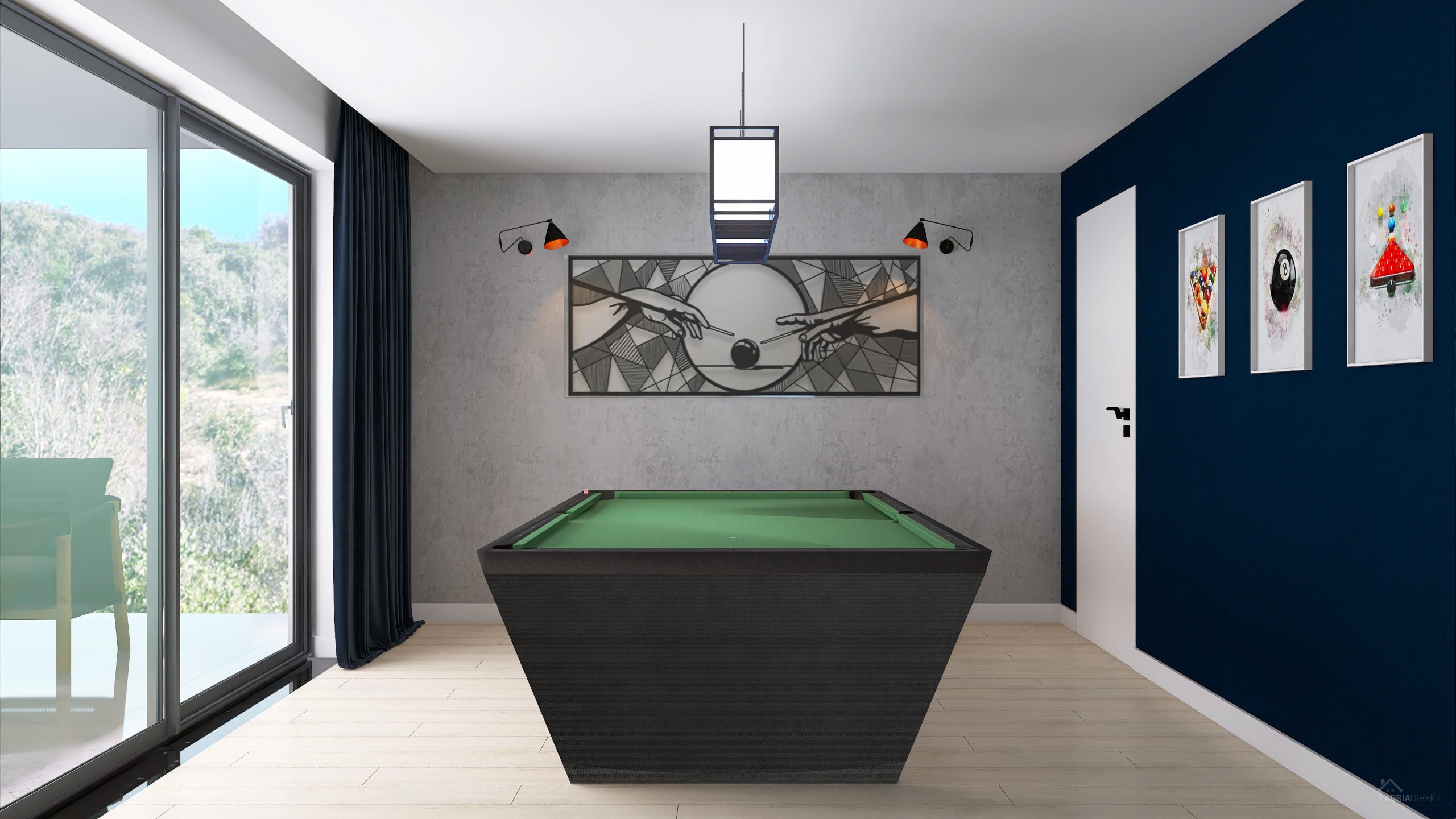 Pritličje: dnevna soba + kuhinja + jedilnica, hodnik, igralnica z biljardno mizo, kopalnica, pralnica, shramba in pokrita terasa.
